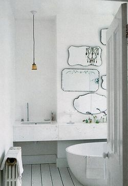 A pretty wall of vintage mirrors via Petits Papier. I do like how this looks and it looks like a great refurb of an older bathroom, but I am not sure I could love with it myself.